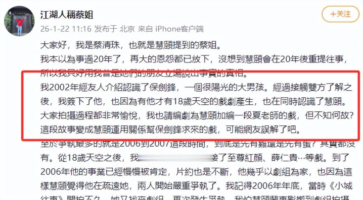 却不意,保剑锋的前牙东谈主蔡清珠陡然下场发文。