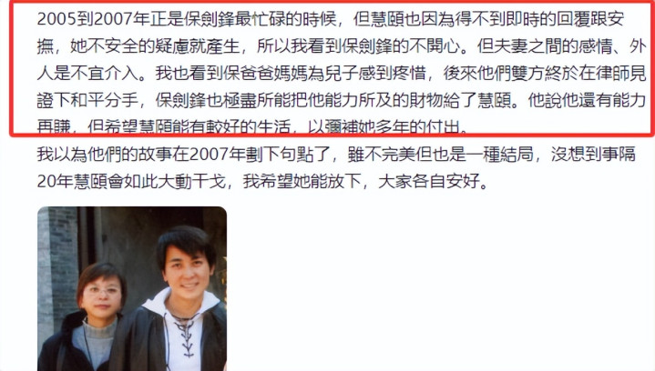 从蔡姐的发文里,咱们不难推断出,黄慧颐与保剑锋的情谊于2007年末画上了句号。