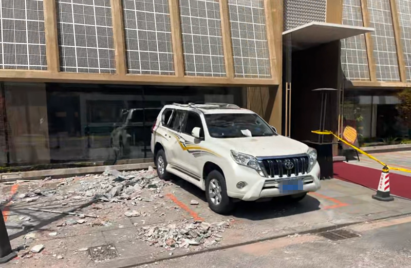 4月12日11点半阁下,市民都先生倏得接到关注市民的电话讲演,他停放在位于中山区东说念主民路的如家商旅栈房楼下的丰田车,被栈房外墙衰退的墙皮砸到了。